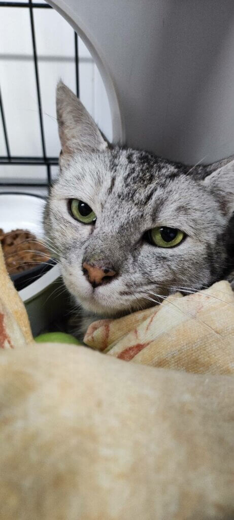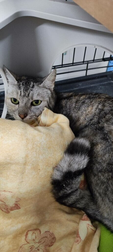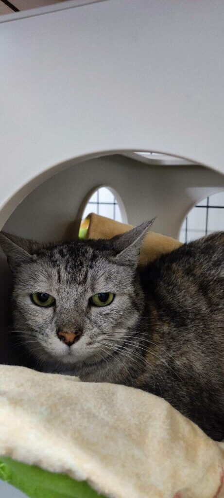 Cocotte est magnifique : un pelage gris tigré tout en nuances, une élégance naturelle, un charme discret… c’est une petite merveille qui attend simplement que quelqu’un voie au-delà de sa peine 🤩